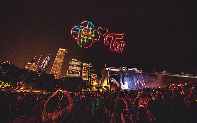 「ONE SPARK」披露後には、夜空にTWICEの公式ロゴや、メンバーをモチーフにしたキャラクター“LOVELY”、グループ名“TWICE”が浮かび上がるドローンショーが実施され、真夏の夜を鮮やかに彩った。