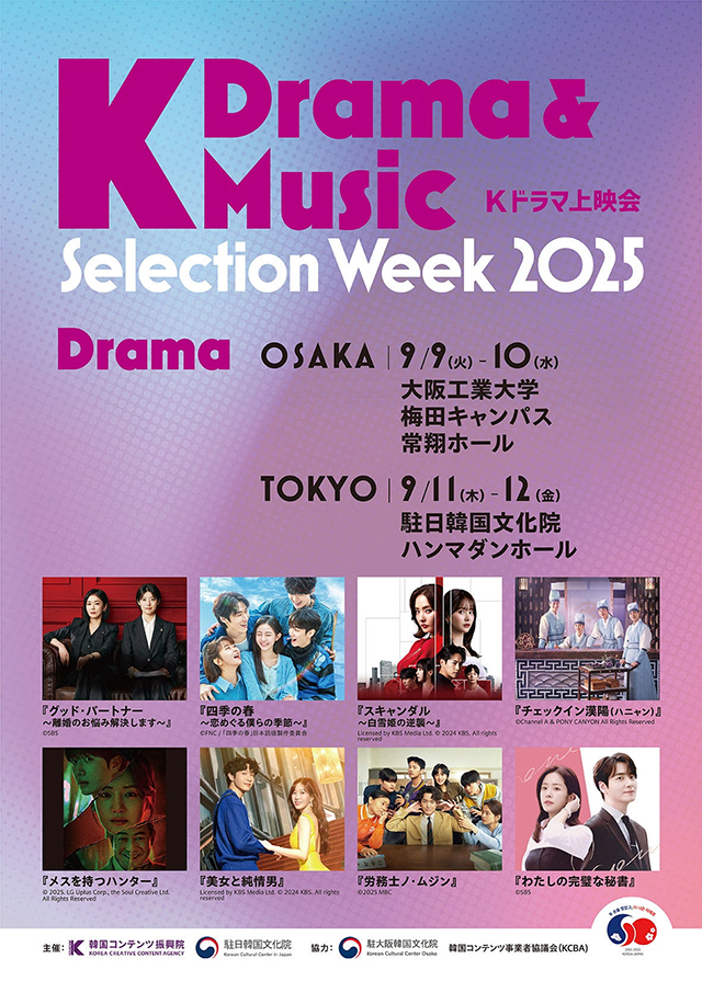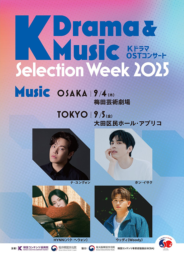韓国コンテンツ振興院(KOCCA)と駐日韓国大使館 韓国文化院は、今年、日韓国交正常化60周年を迎える節目の年を迎えたことを記念して、Kカルチャーの多彩な魅力を伝えるイベント『K Drama & Music Selection Week 2025』を9月4日(木)~12日(金)に東京と大阪の2都市で開催します。