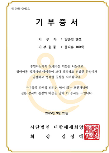 韓国の㈳もっと共に新希望は9月24日、ヤン・ジュニルのファンで構成されたヤン・ジュニルAngelによる寄付式を行なった。